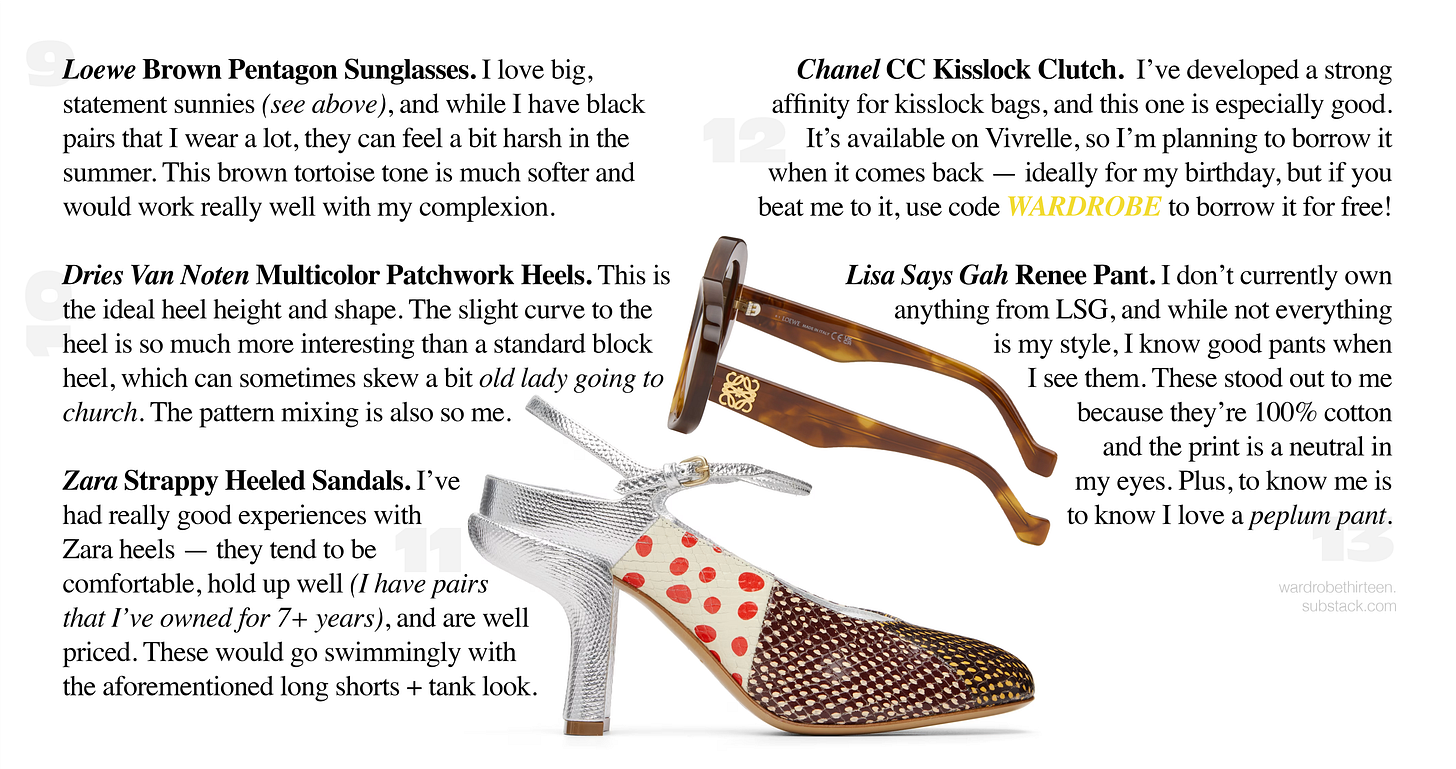 Bermuda Shorts | Puzzle Bag | Crocodile Embossed Flats | Defile Sunglasses | V-Neck Jumper | Deia Sandals | Granville Carryall | Mismatched Pearl Earrings